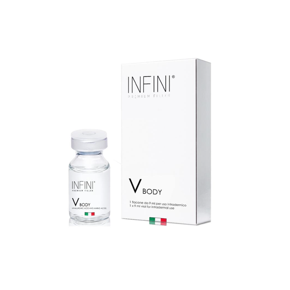 INFINI Premium V Body to jałowy, biokompatybilny wyrób medyczny klasy III w formie roztworu o dużej objętości (9 ml), przeznaczony do biorestrukturyzacji i biostymulacji dużych powierzchni ciała oraz twarzy. Preparat wykorzystuje synergię fragmentowanego kwasu hialuronowego (HAF) oraz aminokwasów prekursorowych kolagenu. Wyrób indukuje biologiczną odnowę macierzy zewnątrzkomórkowej (ECM), co skutkuje poprawą parametrów biomechanicznych skóry, zwiększeniem jej spoistości oraz intensywną hydratacją izoosmotyczną w obszarach dotkniętych wiotkością inwolucyjną.